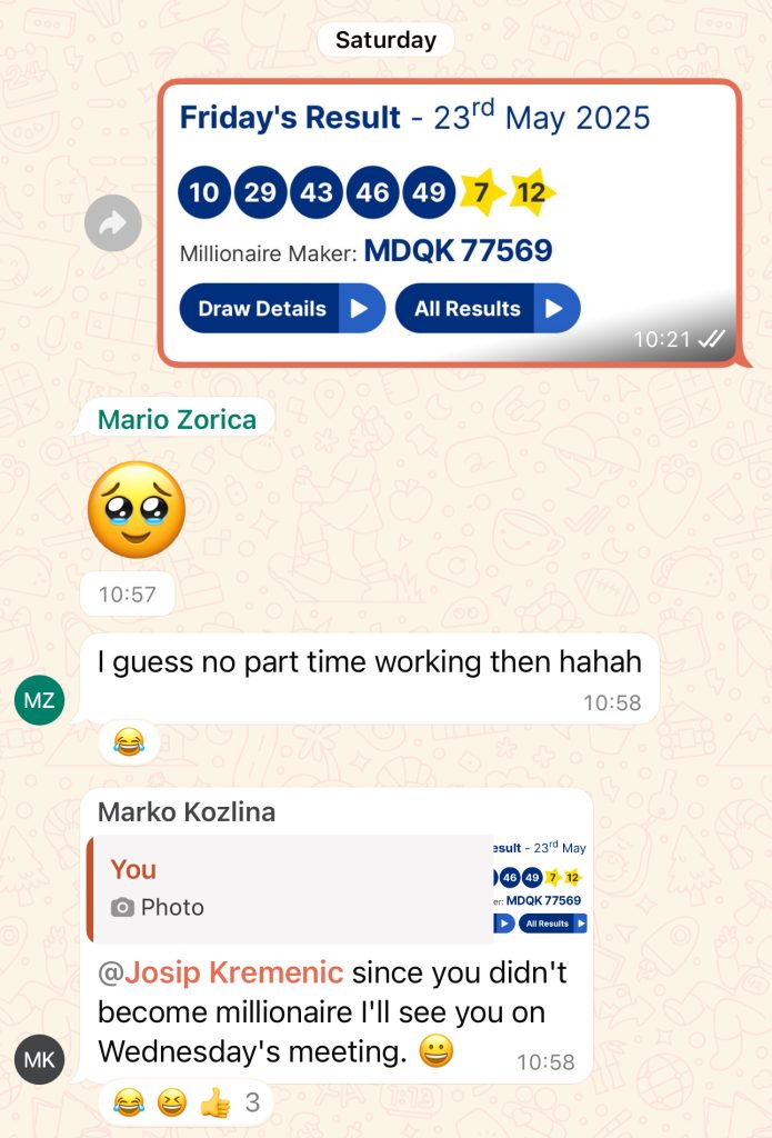 Founders tried to destroy the company by buying everyone lottery tickets for a shared winning pool. The jackpot was 185M EUR, so 23M EUR per employee (before taxes). Imagine the founders’ delight when the results came in: