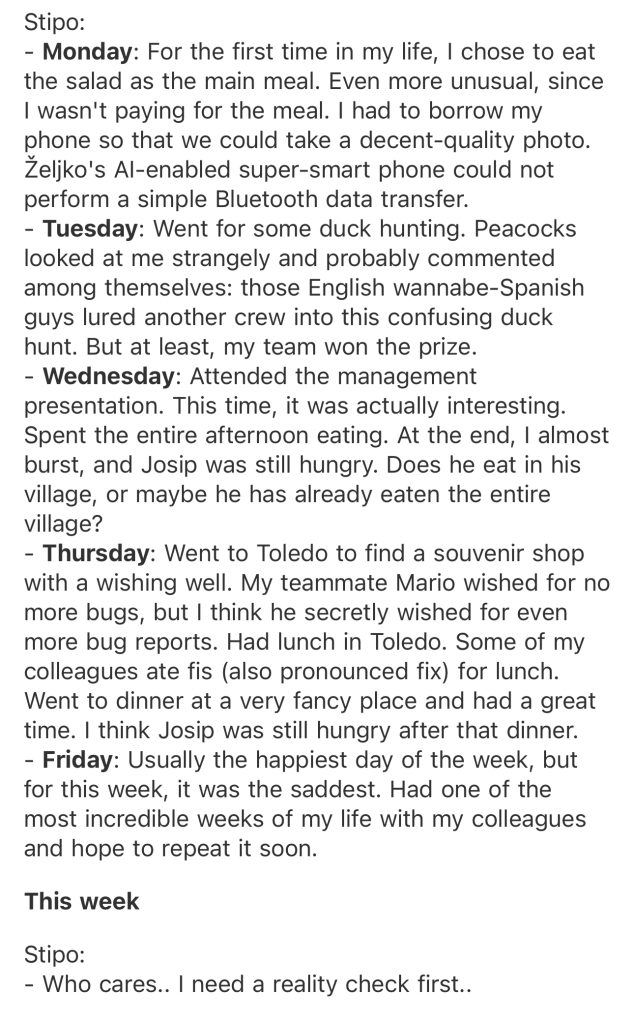 You might be surprised that, although we have 7000+ customers and seven products, the entire GemBox team consists of just eight people. Even better, two of those eight people are founders (Josip and Zel), so the actual work gets done by only six people. A few of them have been with GemBox for more than a decade: Stipo 15+ years, Mario 12+ years, Marko 10 years, Marek 7+ years, Ercan 3+ years, and Mauricio 1 year. The founders had to pay for this work injustice by financing our first international gathering in Madrid. Since GemBox is a 100% remote company, we had colleagues flying from Czechia, Brazil, Turkey, and Croatia, meeting for the first time.